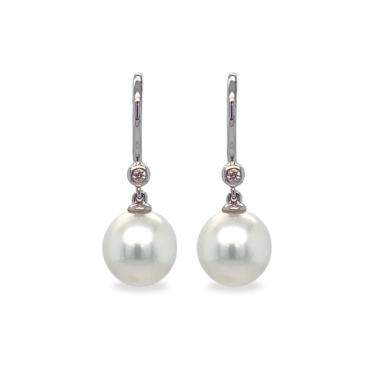 Lustrous 9-10mm South Sea pearls with bezel-set diamonds on 9ct white gold hooks.
